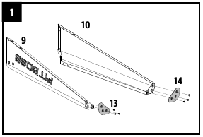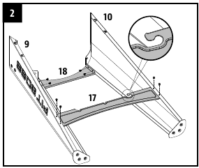 - Pritvirtinkite kiekvieną priekinės lentynos atraminę konsolę prie priekinės atraminės kojos, naudodami du varžtus, poveržles ir fiksavimo poveržles.