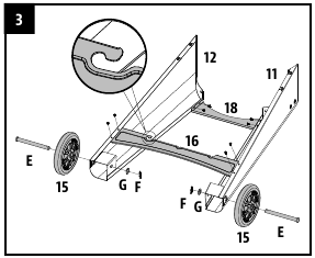 - Pritvirtinkite didelį ratą prie atraminės kojos, įkišdami rato ašies kaištį per rato atraminės kojos skylę, tada pritvirtinkite naudodami rato skeltuvą. Pakartokite montavimą kitam ratui toje pačioje pusėje.