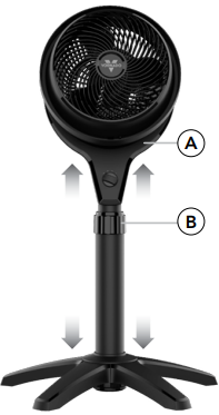 - Palaikykite cirkuliatoriaus galvutę (A) viena ranka. Kita ranka atlaisvinkite reguliavimo žiedą (B) švelniai pasukdami jį prieš laikrodžio rodyklę.