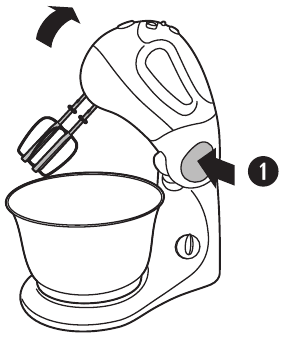 - Įsitikinkite, kad maišytuvas yra atjungtas nuo maitinimo lizdo, o greičio parinkiklis nustatytas į 0 (išjungta). Paspauskite maišytuvo galvutės fiksavimo atleidimo mygtuką ir pakelkite maišytuvo stovo galvutę, kol ji užsifiksuos.