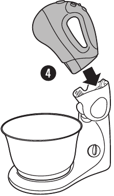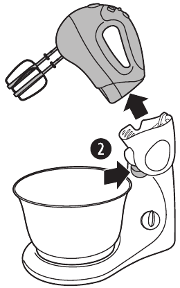 - Prijunkite rankinį maišytuvą prie maišytuvo stovo, įkišdami du stovo dantis į dvi stačiakampes angas rankinio maišytuvo kulne. Paspauskite rankinį maišytuvą žemyn, kol jis užsifiksuos. Įsitikinkite, kad rankinis maišytuvas ir maišytuvo stovas yra tvirtai sujungti.