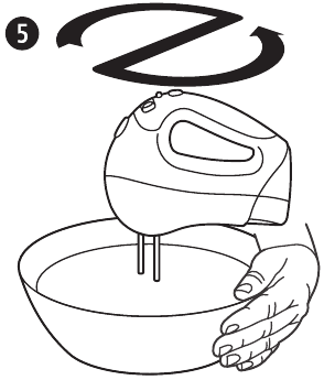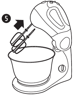 - Įdėkite plaktuvus/tešlos kablius į maišomus ingredientus. Visada laikykite indą arba dubenį, kuriame maišote ingredientus, kai naudojate rankinį maišytuvą. Nustatykite įjungimo/išjungimo greičio parinkimo jungiklį į 1, kad pradėtumėte maišyti. Sureguliuokite greitį pagal poreikį (žr. Maišymo greičiai žemiau).