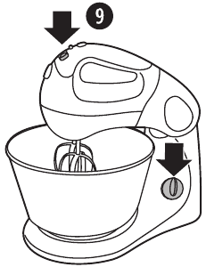 - Baigę maišyti ingredientus, nustatykite įjungimo/išjungimo greičio parinkiklį į 0 (išjungta). Apibraukite plaktuvus/tešlos kablius aplink dubenį, kad pašalintumėte likusius ingredientus.