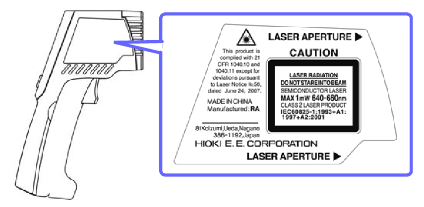 HIOKI "FT3700-20, FT3701-20 infraraudonųjų spindulių termometro" naudojamų lipdukų vieta yra tokia.