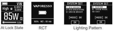 - Ekrano rodymas ("Screen Display"): Įjungus OLED ekrane rodoma įtampa, varža, akumuliatoriaus lygis, temperatūra, išėjimo galia ir kt. Jei nenaudojamas, ekranas po 10 sekundžių pasikeis į realaus laiko laikrodį, o realaus laiko laikrodis bus išjungtas po 15 minučių, jei nenaudojamas. Vieną kartą paspauskite "+" arba "-" arba režimo mygtuką ir ekranas užsidegs rodydamas realaus laiko laikrodį, o dar kartą paspaudus "+" arba "-" arba režimo mygtuką, ekranas užsidegs pagrindiniu meniu. Bet kuriuo metu paspaudus ugnies mygtuką, ekranas užsidegs pagrindiniu meniu.