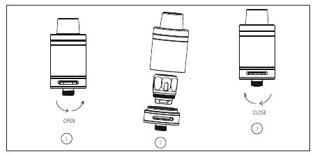 - E-skysčio užpildymas ("Filling E-liquid"): „Slide-n-Fill“ dizainas reikalauja tik paslinkti viršutinę lūpą prieš laikrodžio rodyklę iki galo. Užpildykite sultis per angą ir paslinkite viršų atgal.