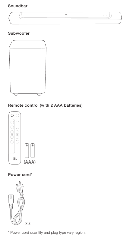 JBL BAR 500 (garso juosta ir žemų dažnių garsiakalbis) suprojektuotas naudoti su 100–240 voltų, 50/60 Hz kintamosios srovės maitinimu. Prijungus prie tinklo įtampos, kuri skiriasi nuo tos, kuriai skirtas jūsų gaminys, gali sukelti pavojų saugumui ir gaisrui bei sugadinti įrenginį. Jei turite klausimų apie jūsų konkretaus modelio įtampos reikalavimus arba apie tinklo įtampą jūsų vietovėje, prieš įjungdami įrenginį į sieninį lizdą, susisiekite su savo mažmenininku arba klientų aptarnavimo atstovu.