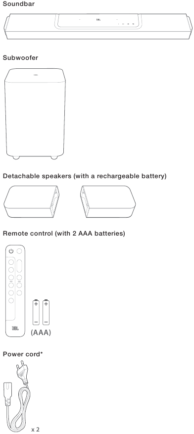Dėkojame, kad įsigijote JBL Bar 1300X (garso juosta, atjungiami garsiakalbiai ir žemų dažnių garsiakalbis), skirtą suteikti nepaprastą garso patirtį jūsų namų pramogų sistemai. Rekomenduojame skirti kelias minutes šiam vadovui perskaityti, kuriame aprašomas gaminys ir pateikiamos nuoseklios sąrankos ir pradžios instrukcijos.