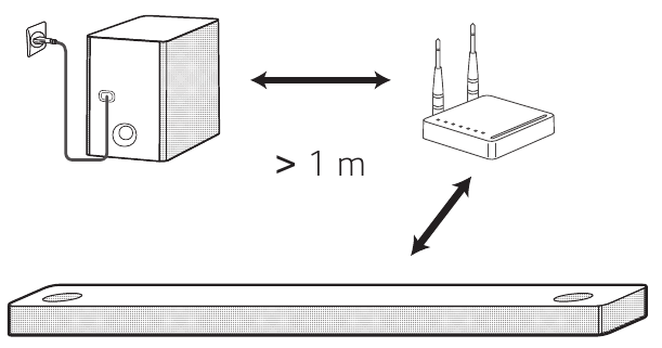 Laikykite garso juostą ir žemų dažnių garsiakalbį toliau nuo įrenginio (pvz., belaidžio maršrutizatoriaus, mikrobangų krosnelės ir kt.) daugiau nei 1 m atstumu, kad išvengtumėte belaidžių trukdžių.