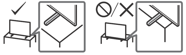 - Installeer de tv zo dat de tafelstandaard van de tv niet uit de tv-standaard steekt (niet meegeleverd). Als de tafelstandaard uit de tv-standaard steekt, kan dit ertoe leiden dat de tv omvalt, valt en persoonlijk letsel of schade aan de tv veroorzaakt.