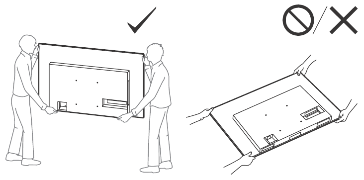 - Houd de tv vast zoals hieronder wordt weergegeven wanneer u hem met de hand vervoert. Oefen geen druk uit op het paneel en het frame rond het scherm.