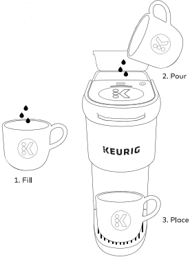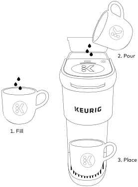 Voeg 1 kop (240 ml) water toe in een mok. Til het deksel van het waterreservoir op en giet het water in het reservoir. Vul niet voorbij de MAX-lijn of onder de MIN-lijn. Laat het deksel zakken en plaats uw mok op de lekbak.