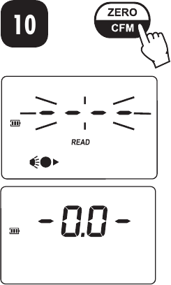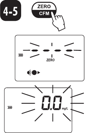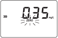 - Druk op ZERO/CFM (Nul/CFM) en de lamp-, cuvette- en detectorpictogrammen verschijnen op het display, afhankelijk van de meetfase. Na enkele seconden toont het display "-0.0-". De meter is nu op nul gezet en klaar voor de meting.