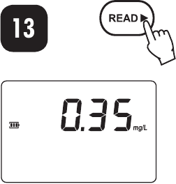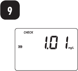 en het display toont de lamp-, cuvette- en detectorpictogrammen, afhankelijk van de meetfase. Aan het einde van de meting geeft het instrument direct de concentratie in mg/L chloordioxide weer op het LCD.