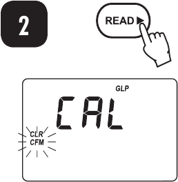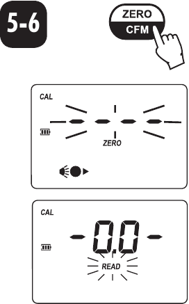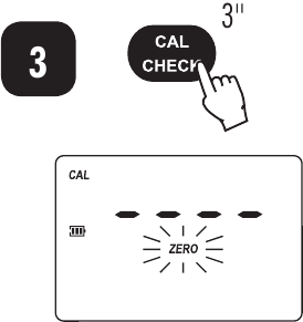 - Houd CAL CHECK drie seconden ingedrukt om de kalibratiemodus te openen. Het display toont "CAL" tijdens de kalibratieprocedure. De knipperende "ZERO" (Nul) vraagt om het instrument op nul te zetten.
