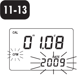 om het gewenste jaar te bewerken (2009-2099). Als de toets ingedrukt wordt gehouden, wordt het jaartal automatisch verhoogd. - Wanneer het juiste jaar is ingesteld, druk op ZERO/CFM (Nul/Bevestigen) of READ (Lezen)