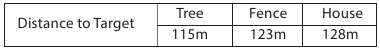 "115m" (afstand tot de boom) wordt weergegeven in de modus Eerste-doelprioriteit, en "128m" (afstand tot het huis) in de modus Verre-doelprioriteit. De modus Eerste-doelprioriteit heeft bijvoorbeeld toepassingen voor golf, terwijl Verre-doelprioriteit nuttig is bij het jagen in zwaar beboste gebieden.