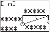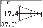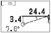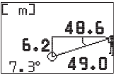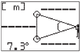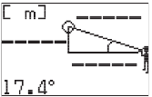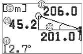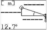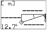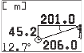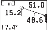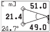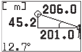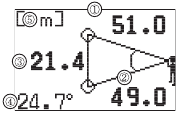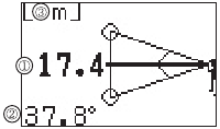 Na het meten van de horizontale afstand en twee hoeken en de hoogte, worden "verticale scheiding (hoogte) en hoek tussen twee punten" weergegeven. Eenheden kunnen worden weergegeven in meters, yards of feet. Hoeken worden aangegeven met ° (graden).