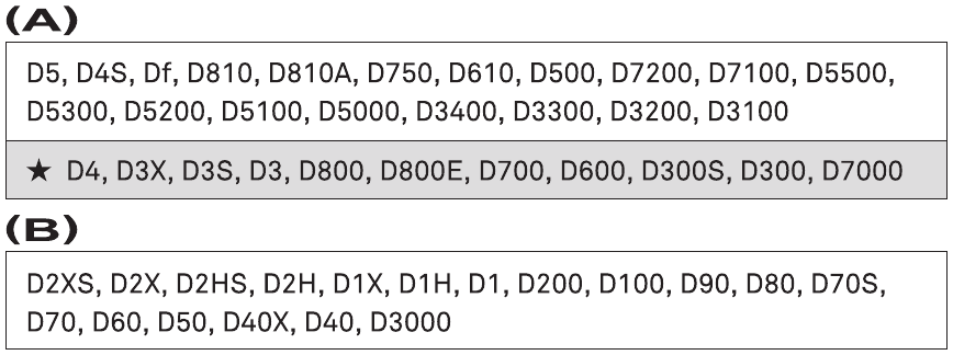 Deze lens is voorzien van een elektromagnetisch diafragma, dezelfde specificaties als het E-type mechanisme in Nikon AF-lenzen. De lens is compatibel met de camera's die in tabel (A) worden vermeld. (De modellen met het Ŭ-teken vereisen de nieuwste versie van de camerafirmware om compatibiliteit te garanderen.)