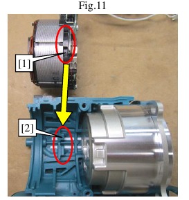 - Lijn de inkeping van Stator [1] uit met de uitstulping van Housing L [2] en monteer de twee delen aan elkaar.