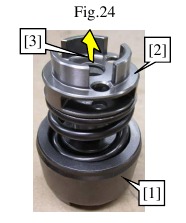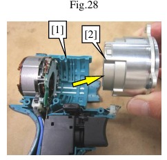 - Duw en monteer Nylon washer 28 [1] en Anvil E [2] in Hammer case [3]. Doe hetzelfde in het geval van Anvil A. Links afgebeeld is Anvil E [2].