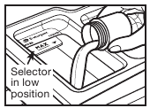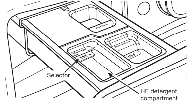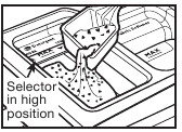Giet een afgemeten hoeveelheid HE-wasmiddel in het wasmiddelcompartiment. Til voor poederwasmiddel de selector omhoog naar de hoge stand. Duw voor vloeibaar wasmiddel de selector naar beneden naar de lage stand. Niet overvullen; het toevoegen van te veel wasmiddel kan ertoe leiden dat het wasmiddel te vroeg in de wasmachine wordt gedoseerd.