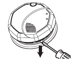 - Etter 10 års drift eller lavt batterinivå, deaktiver alarmen: Sett inn et verktøy under kanten der det vises, og brekk tappen. Skyv deretter aktiveringsbryteren til deaktiveringsmodus.
