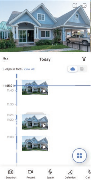 Start EZVIZ-appen, trykk på Live View (Direktevisning)-knappen, du kan se og lytte til en direkte feed, ta øyeblikksbilder, ta opp videoer og velge videodefinisjon etter behov.