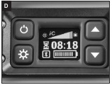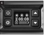 - Trykk på strømknappen på tastaturet én gang for å slå på. Standardinnstillingen er forhåndsinnstilt høy modus (som indikert av de tre "sol"-symbolene øverst på skjermen). Gjenstående driftstid vises midt på skjermen, og batterinivået vises nederst på skjermen. (C)