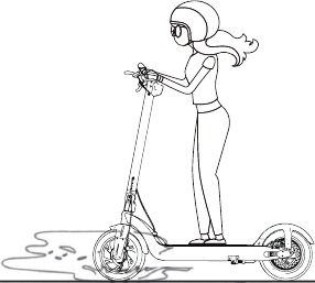 Ikke kjør i kraftig regn eller ekstreme temperaturforhold. Ikke kjør i en dam dypere enn 1,5 tommer. Den elektriske sparkesykkelen kan skli og forårsake skade. Disse forholdene kan skade elektronikken og ugyldiggjøre garantien.