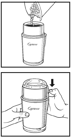 Når du kverner maksimal mengde kaffe, anbefaler vi å kverne i 20 til 30 sekunder. For best resultat, kvern i intervaller på 10 sekunder (maks. 40g). Når bladet slutter å rotere, trykk lett på kvernen, og start deretter kverningen igjen. Dette vil minimere mengden kaffe som fester seg til bunnen av kvernebeholderen. MERK: Når du bruker oljete kaffebønner, kan den malte kaffen klebe seg sammen og bygge seg opp på sidene av kvernen. For å unngå søl når du fjerner lokket, trykk ganske enkelt lett på kvernen for å bryte opp kaffe som fester seg til veggene i kvernen. Vi anbefaler ikke å kverne i mer enn 30 sekunder. Hvis du kverner lenger, vil kaffen bli varmere og miste noe av smaken.