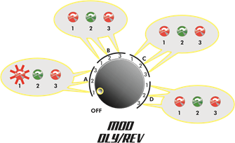 MOD- og DLY / REV-knappene deler de samme tre valgindikator-LED-ene. Uansett hvilken knapp som ble vridd sist, er knappen som for øyeblikket er tilknyttet disse 3 indikator-LED-ene: