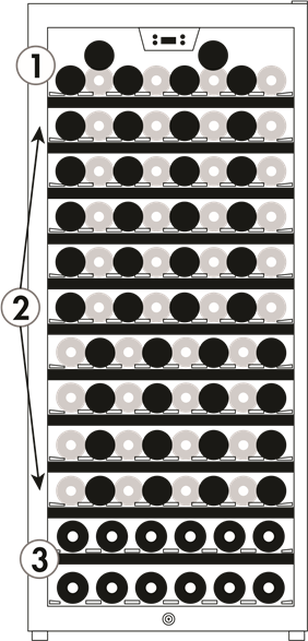 For å oppnå maksimal kapasitet, bør flasker plasseres i en hode-til-hale-konfigurasjon på alle unntatt de to nederste hyllene.