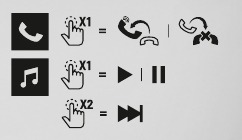 ![]() | END CALL (avslutt samtale): SINGLE CLICK THE CONTROL KNOB (trykk én gang på kontrollknappen). | ![]() | NEXT SONG (neste sang): PUSH THE CONTROL KNOB TO THE RIGHT (skyv kontrollknappen til høyre). | ![]() | TURN VOLUME DOWN (skru ned volumet): PUSH THE CONTROL KNOB DOWNWARD (skyv kontrollknappen nedover). |