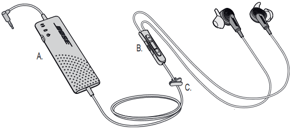 - Koble Bose-hodetelefonene til standard 3,5 mm ® QuietComfort® 20 hodetelefonkontakt på din iPod, iPhone eller iPad. Hodetelefonene leveres med en innebygd mikrofon og fjernkontroll med 3 knapper for praktisk kontroll av utvalgte iPod-, iPhone- og iPad-modeller.