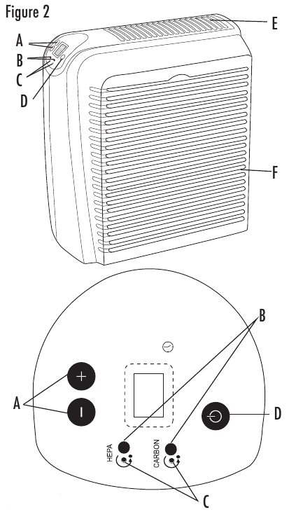 ). Czerwona dioda LED to lampka filtra HEPA, a żółta dioda LED to lampka filtra węglowego.