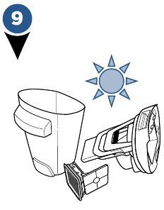 - Przed każdym użyciem przytrzymaj spust rozpylacza roztworu przez 10 sekund, aby przygotować system za pomocą roztworu czyszczącego. Diody LED zaświecą się podczas trzymania spustu.