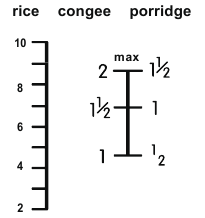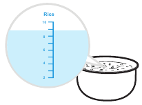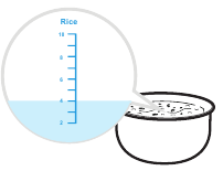 - Rozluźnij ryż; posyp 50-80 gramów wody na powierzchni ryżu (weź jako przykład ilość ryżu poniżej znaku 2).