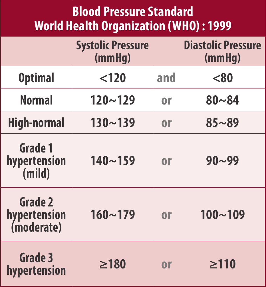 Odnosząc się do definicji Światowej Organizacji Zdrowia, zakresy ciśnienia krwi można podzielić na 6 stopni. (Odn. 1999 WHO-International Society of Hypertension Guidelines for the management of Hypertension). Ta klasyfikacja ciśnienia krwi opiera się na danych historycznych i może nie mieć bezpośredniego zastosowania do konkretnego pacjenta. Ważne jest, aby regularnie konsultować się z lekarzem. Lekarz poinformuje o prawidłowym zakresie ciśnienia krwi, a także o punkcie, w którym zostanie się uznanym za osobę zagrożoną. W celu wiarygodnego monitorowania i odniesienia ciśnienia krwi zaleca się prowadzenie długoterminowych zapisów. Proszę pobrać dziennik ciśnienia krwi z naszej strony internetowej www.rossmax.com.