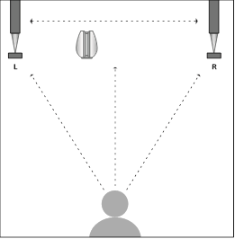Idealnie byłoby, gdyby subwoofer był umieszczony w odległości od ulubionej pozycji odsłuchowej, co mniej więcej odpowiada odległości od przedniego zestawu głośników, to znaczy lewego, (środkowego) i prawego głośnika. Jeśli to możliwe, należy wybrać umieszczenie między dwoma przednimi głośnikami.