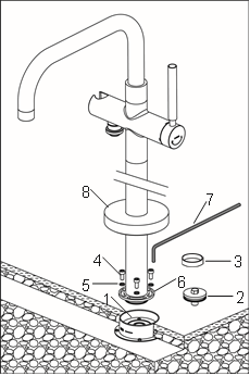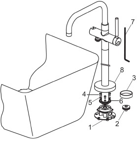 Zakręć dopływ wody. Wyjmij korek (2) z podstawy. Przesuń rozetę (8) do góry. Zdejmij osłonę (3). Zamontuj baterię.