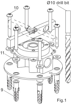 Zaznacz położenie otworów montażowych podstawy na podłodze zgodnie z ustalonym położeniem i wymiarami montażowymi podstawy (jak pokazano). Poluzuj śruby. Zdejmij baterię i złączki z o-ringami. Wywierć otwory w podłodze wiertłem łopatkowym Ø10. Wciśnij kotwy (9) w otwory. Wkręć wkręty samogwintujące (10) z podkładkami (11) w kotwy przez podstawę. Użyj poziomicy, aby upewnić się, że podstawa jest pozioma (patrz rys. 1). Dokręć wkręty samogwintujące, aby zabezpieczyć podstawę.