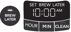 - Wskaźnik Brew Later (Parz później) zaświeci się, pokazując, że ekspres do kawy jest wstępnie ustawiony na parzenie w późniejszym czasie.