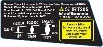 - Wskaźnik laserowy klasy II IRT205 emituje mniej niż 1mW promieniowania. Należy jednak unikać patrzenia bezpośrednio na laser i nigdy nie kierować go na ludzi ani zwierzęta. Ochrona oczu jest zwykle zapewniana przez odruch mrugania.