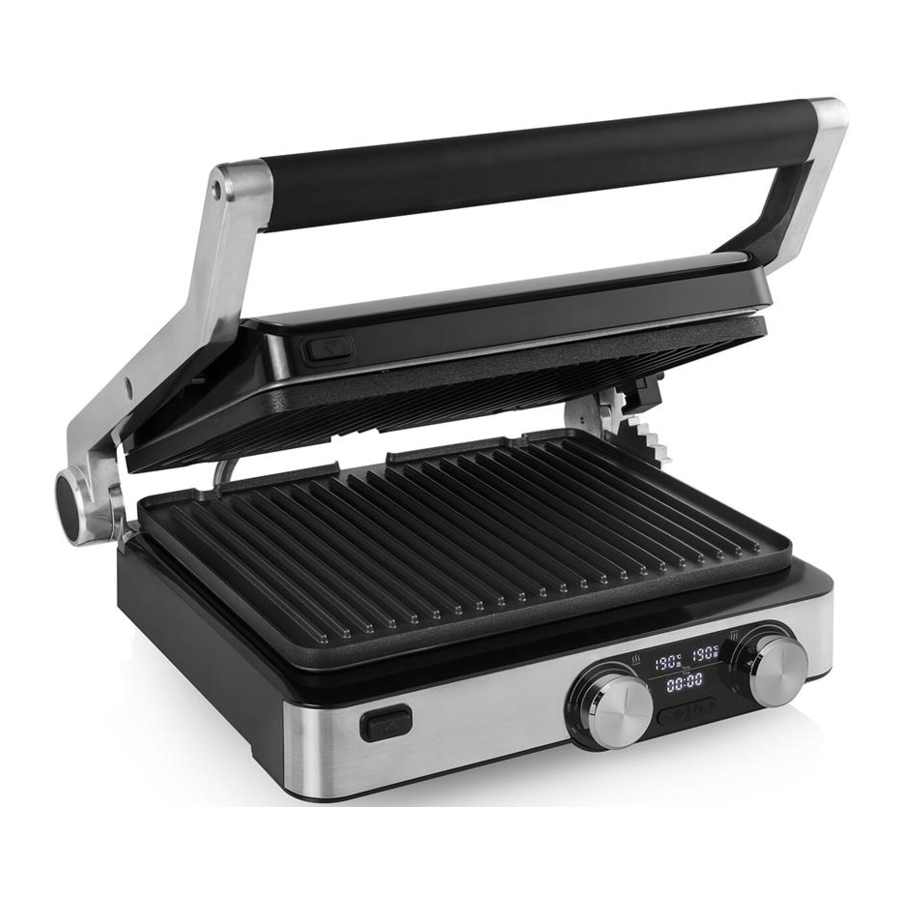 - Urządzenie nadaje się również do użytku jako grill stołowy. Naciśnij przycisk otwierania 180° i otwórz na płasko na powierzchni odpornej na ciepło.