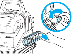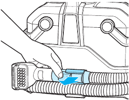 - Aby odłączyć narzędzia, naciśnij przycisk nad uchwytem węża i pociągnij prosto w dół. (NIE przekręcaj narzędzia, aby je wyjąć).