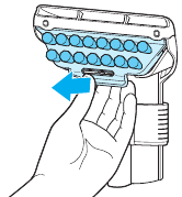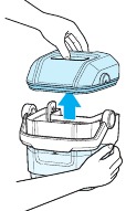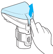 - Aby zdjąć pokrywę, przytrzymaj dolną część zbiornika na brudną wodę i użyj wkładki uchwytu, aby podnieść i zdjąć.