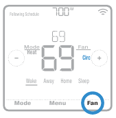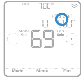 - Toque em Mode (Modo) na tela inicial do termostato e defina o sistema para Heat (Aquecimento). Certifique-se de que o ponto de ajuste de temperatura (o menor dos dois números) seja maior que a temperatura interna (o número grande no centro da tela).