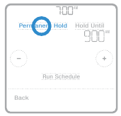 - Toque em Hold Until (Manter até). Permanent Hold (Espera permanente) aparecerá na tela. Toque em Permanent Hold (Espera permanente) para manter essa temperatura até que você a altere manualmente.