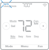 - Toque em Mode (Modo) na tela inicial do termostato e defina o sistema para Cool (Resfriamento). Certifique-se de que o ponto de ajuste de temperatura (o menor dos dois números) seja menor que a temperatura interna (o número grande no centro da tela).